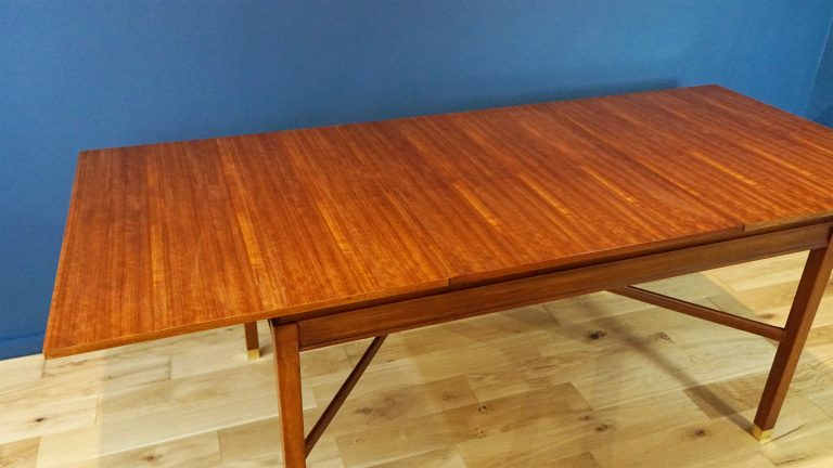 Several design details distinguish this model. The table features an unusual bent-wood stretcher, shaped into a curved structural brace, introducing a sculptural quality rarely seen in more conventional British dining tables of the period. This is paired brass fixings, adds a subtle metallic accent that reflects G Plan’s growing interest in mixed materials. The table also bears an early E. Gomme ‘G Plan’ gold stamp, associated with the emerging brand’s first years of production.