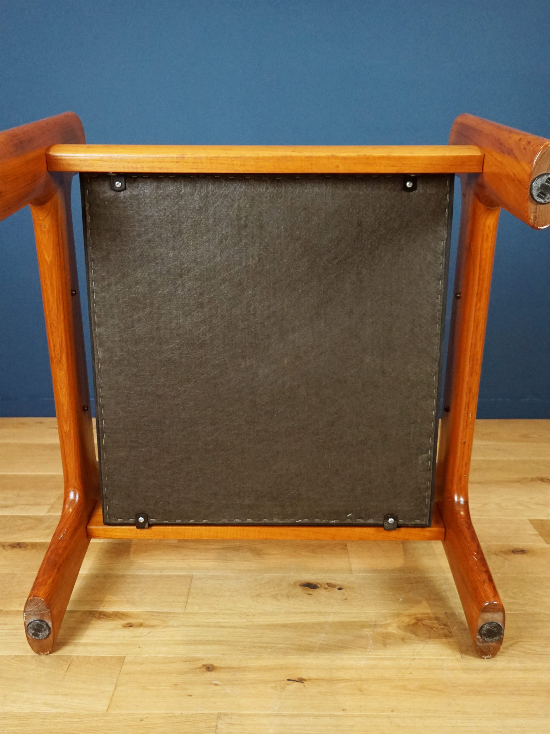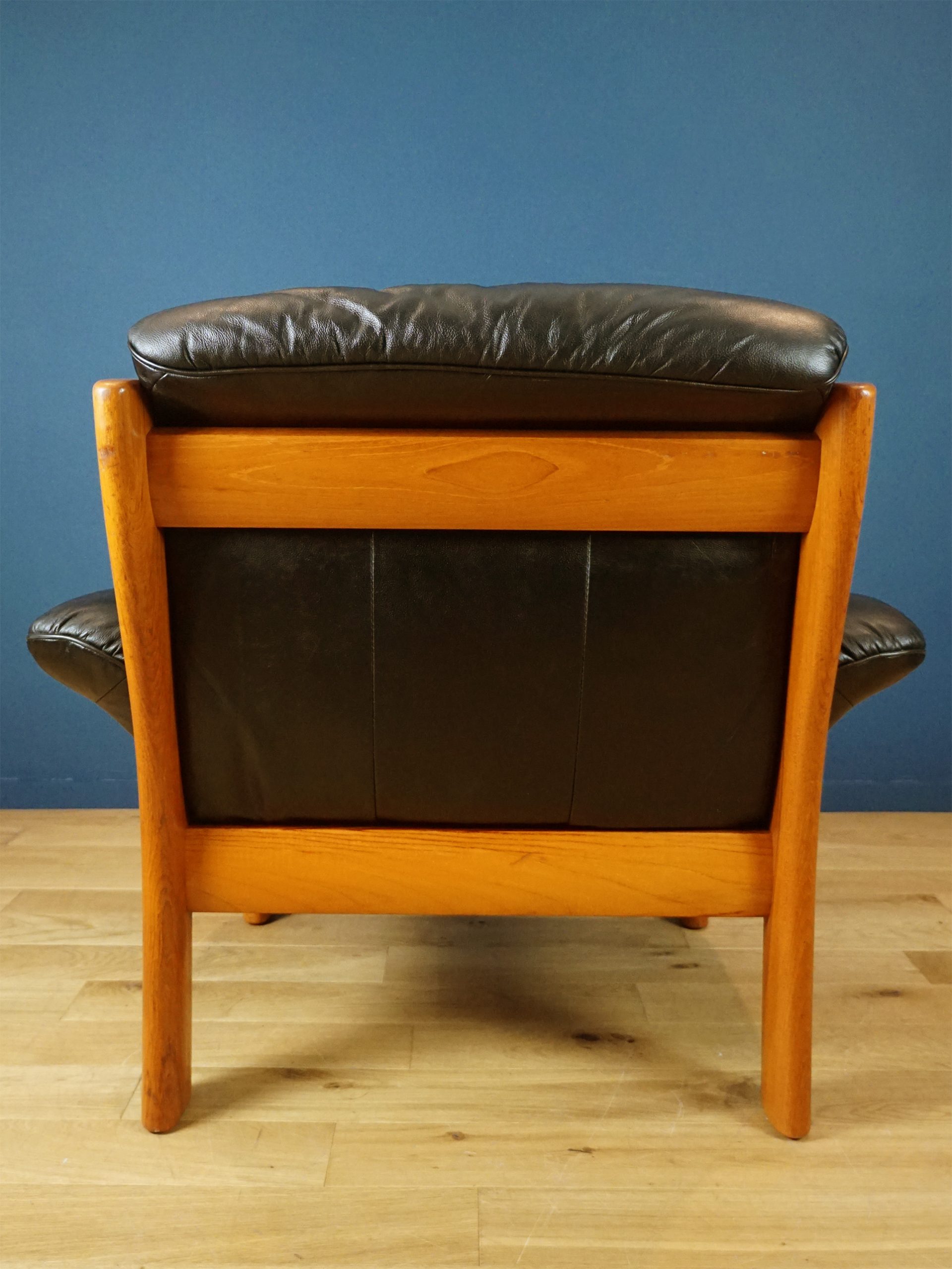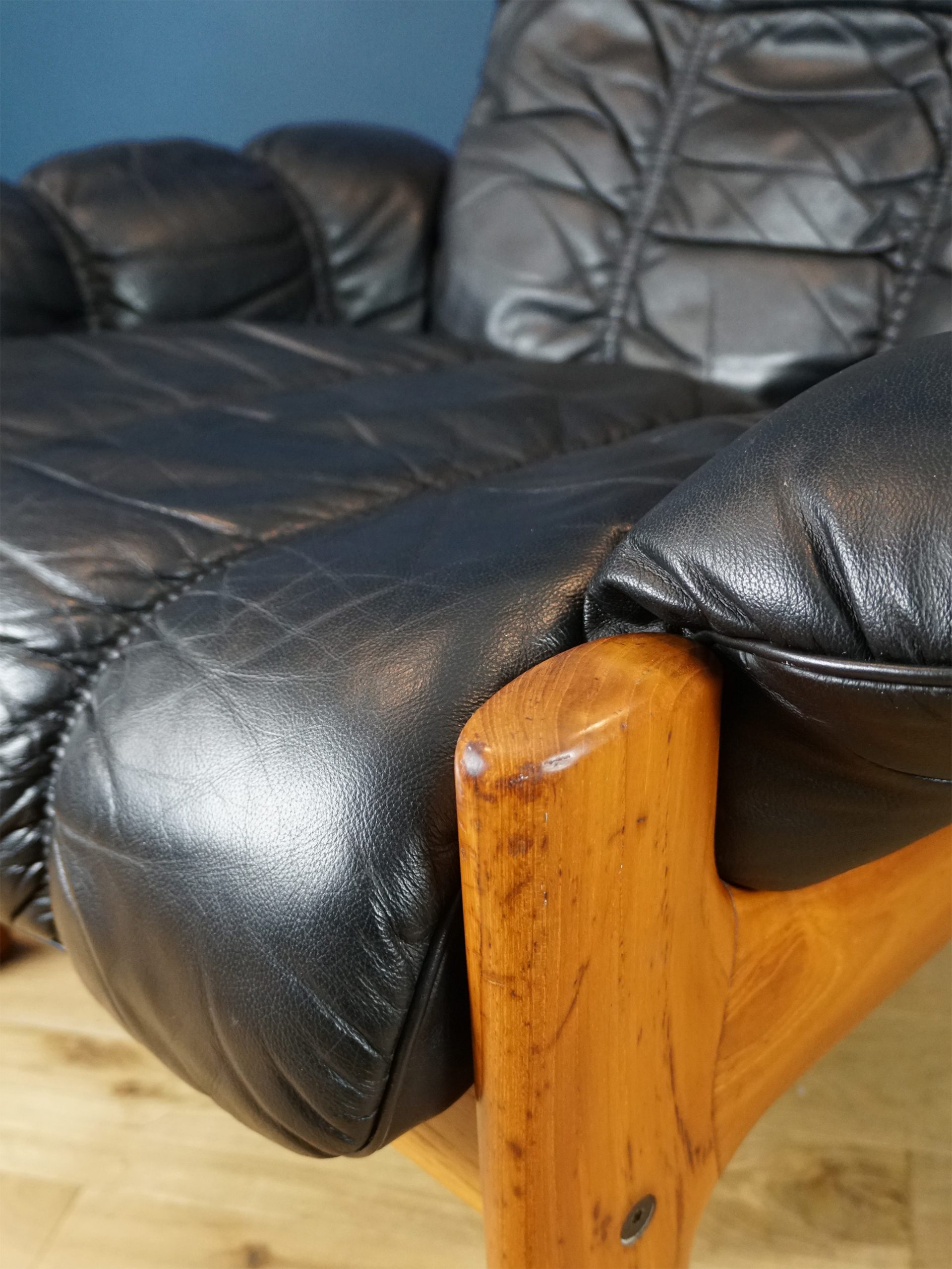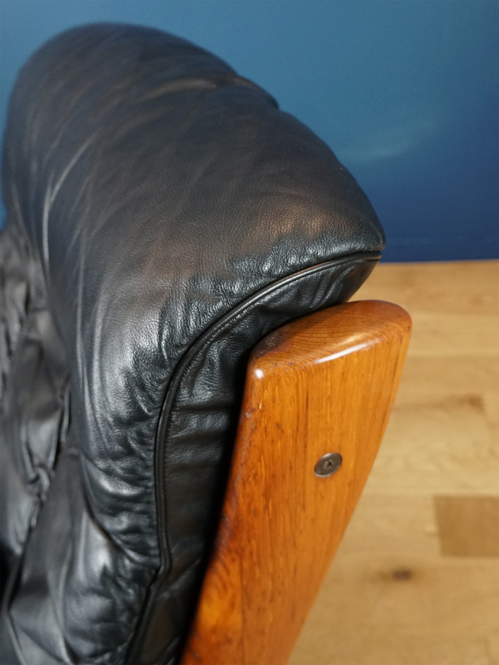 The leather remains in excellent vintage condition, showing minor, natural creasing but no cracks, splits or structural issues. It has been professionally deep-cleaned and conditioned. The teak frame retains its original patina with light age-related marks to the arm tops, consistent with careful use. The wood has been lightly refreshed to nourish and enhance the grain while preserving its character.