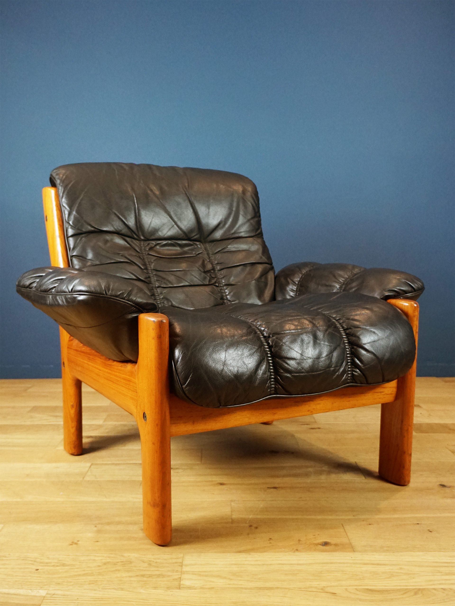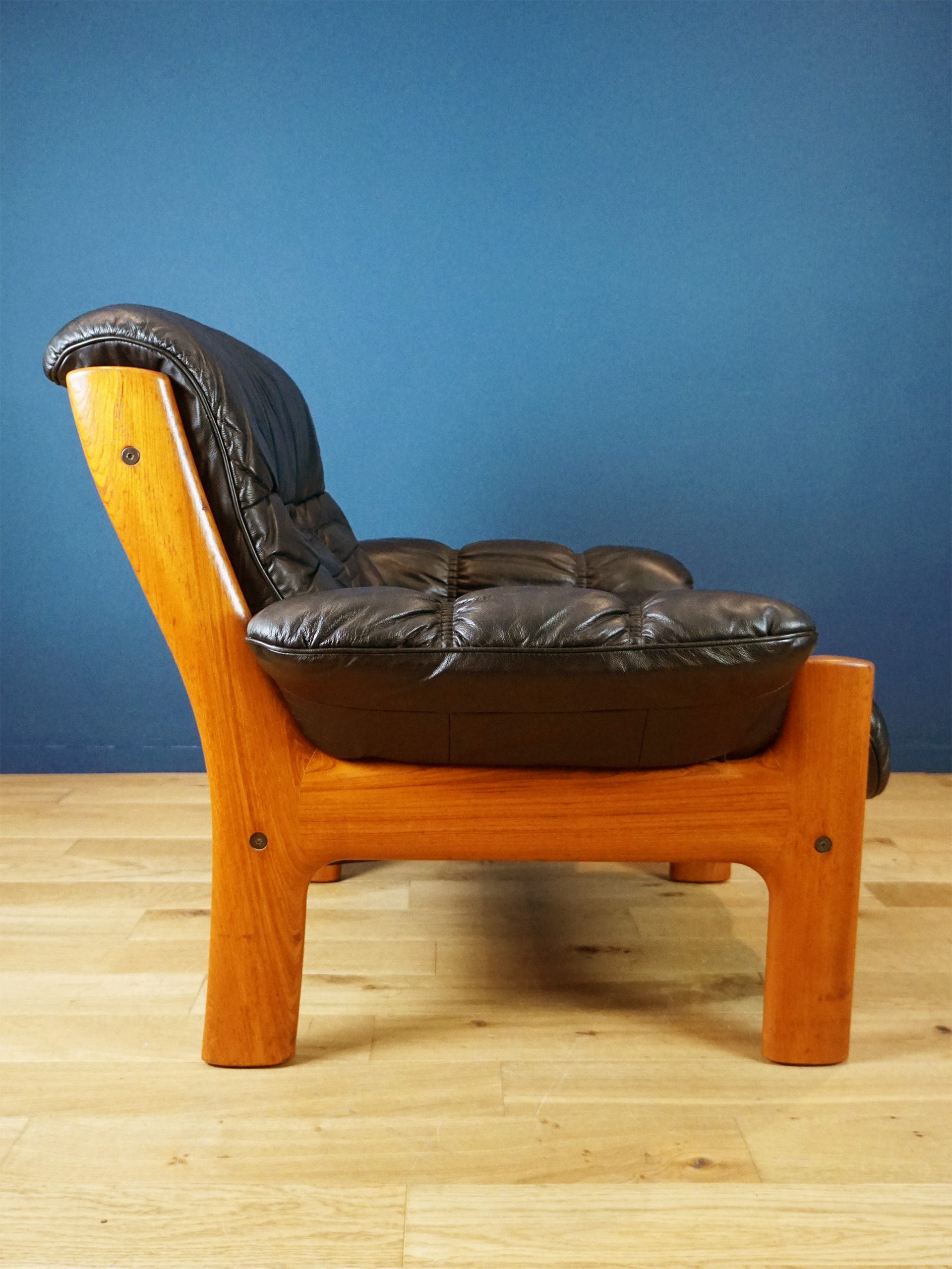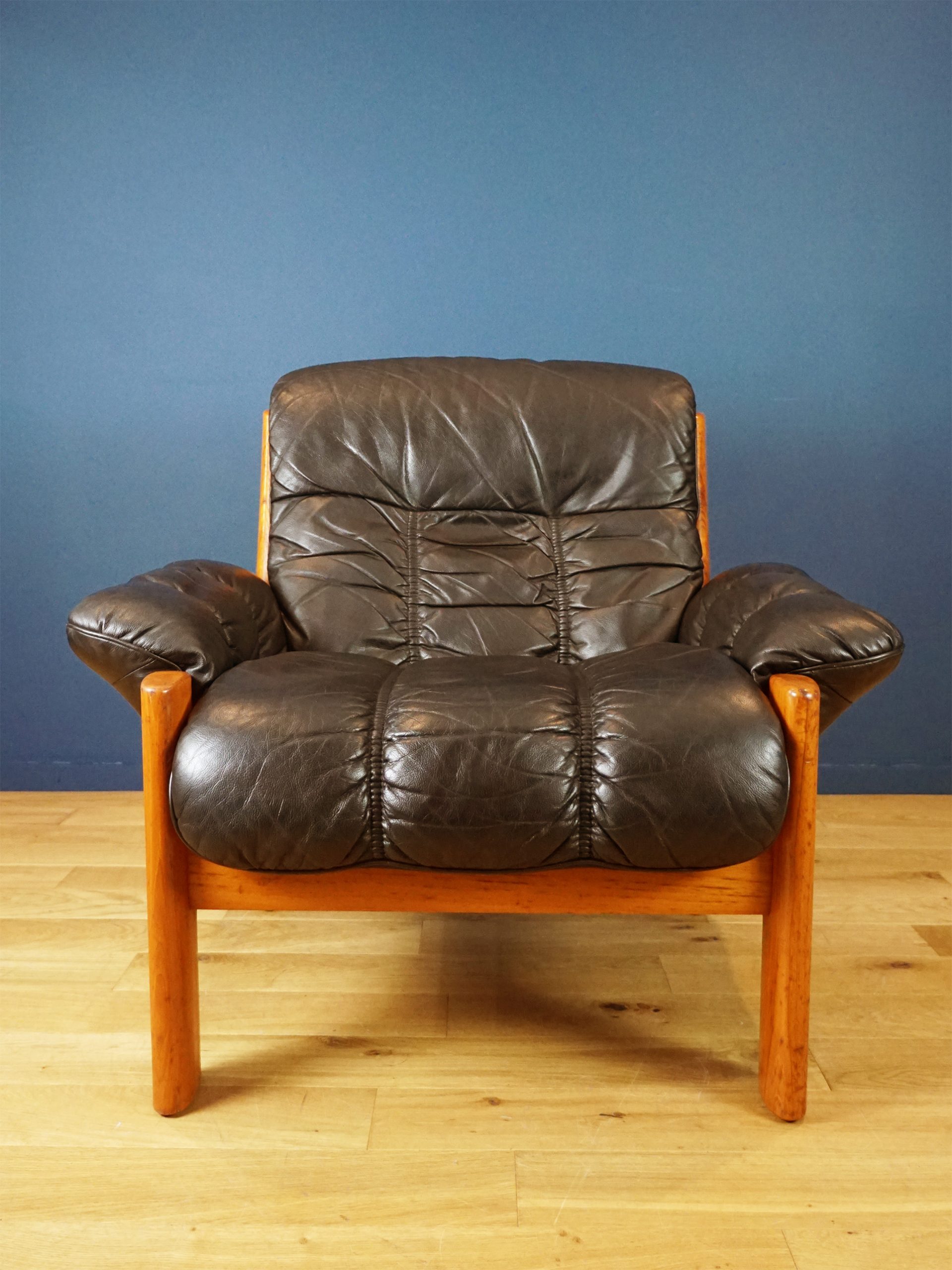 The chair combines substantial rounded teak arms with generously padded leather cushions, creating a form that is both sculptural and exceptionally comfortable. The pronounced stitched detailing across the seat and back is typical of 1970s Ekornes design, before the cleaner, more minimal aesthetic of later decades.