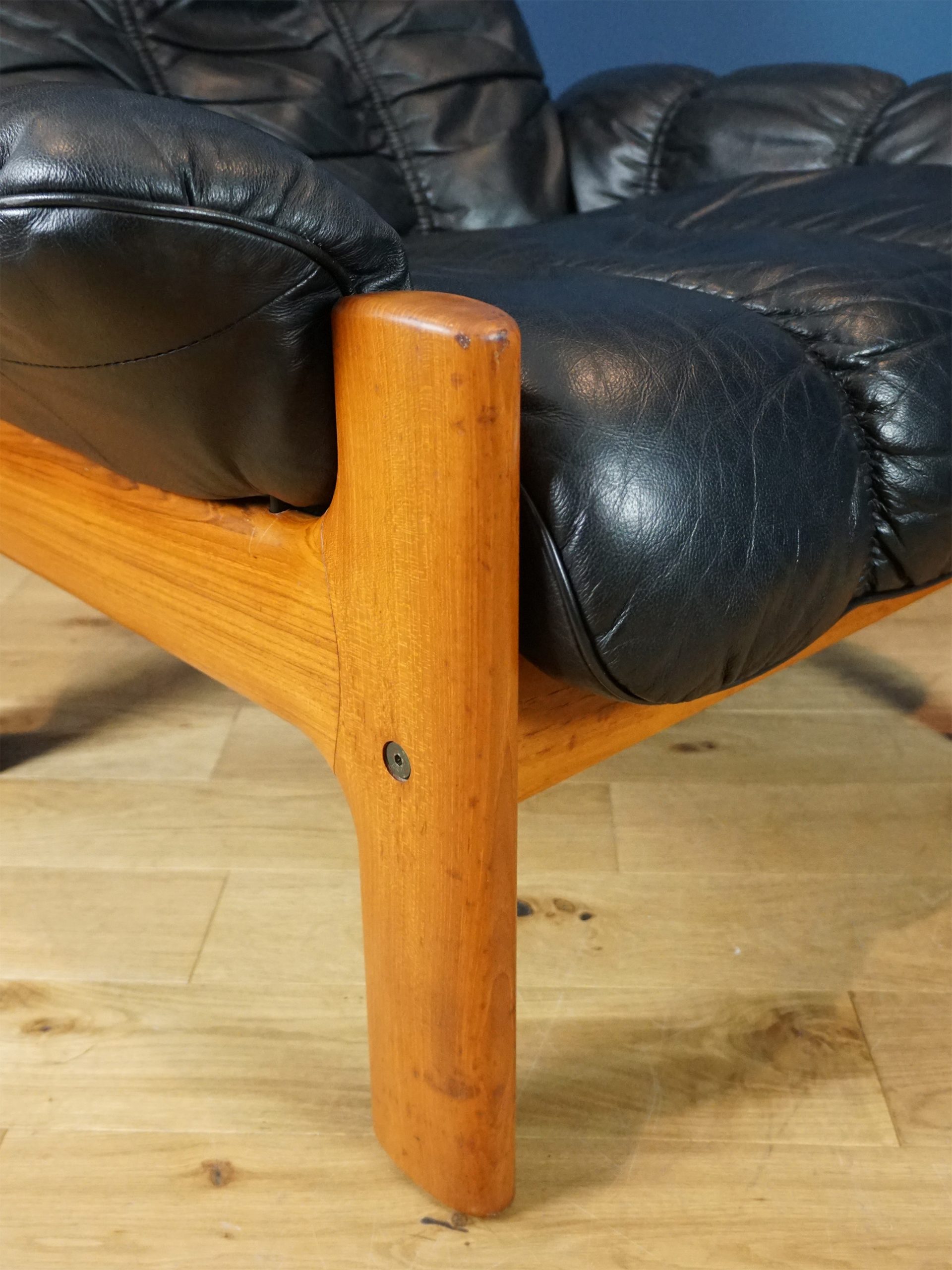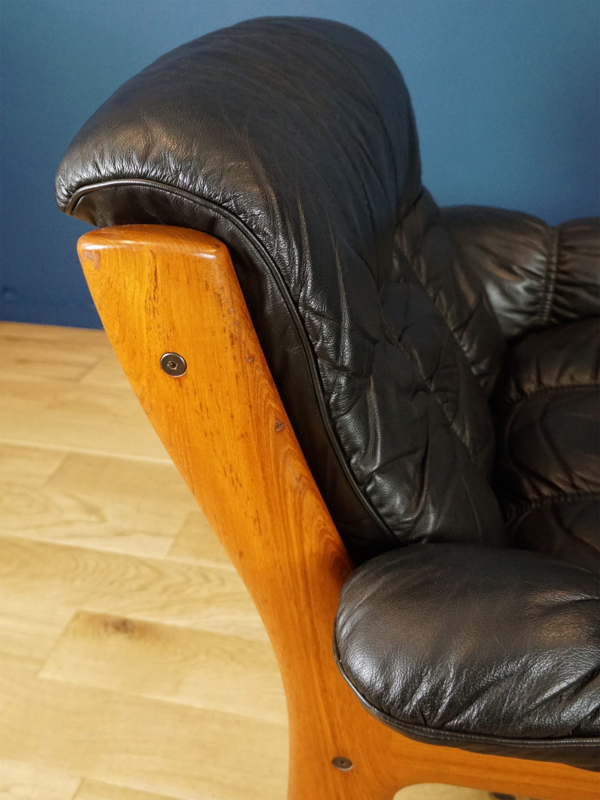 An early Ekornes “Montana” lounge chair, produced in Norway in the 1970s. This example retains the solid teak frame construction, serpentine spring seat support and deeply stitched black leather upholstery characteristic of Ekornes’ earlier production period.