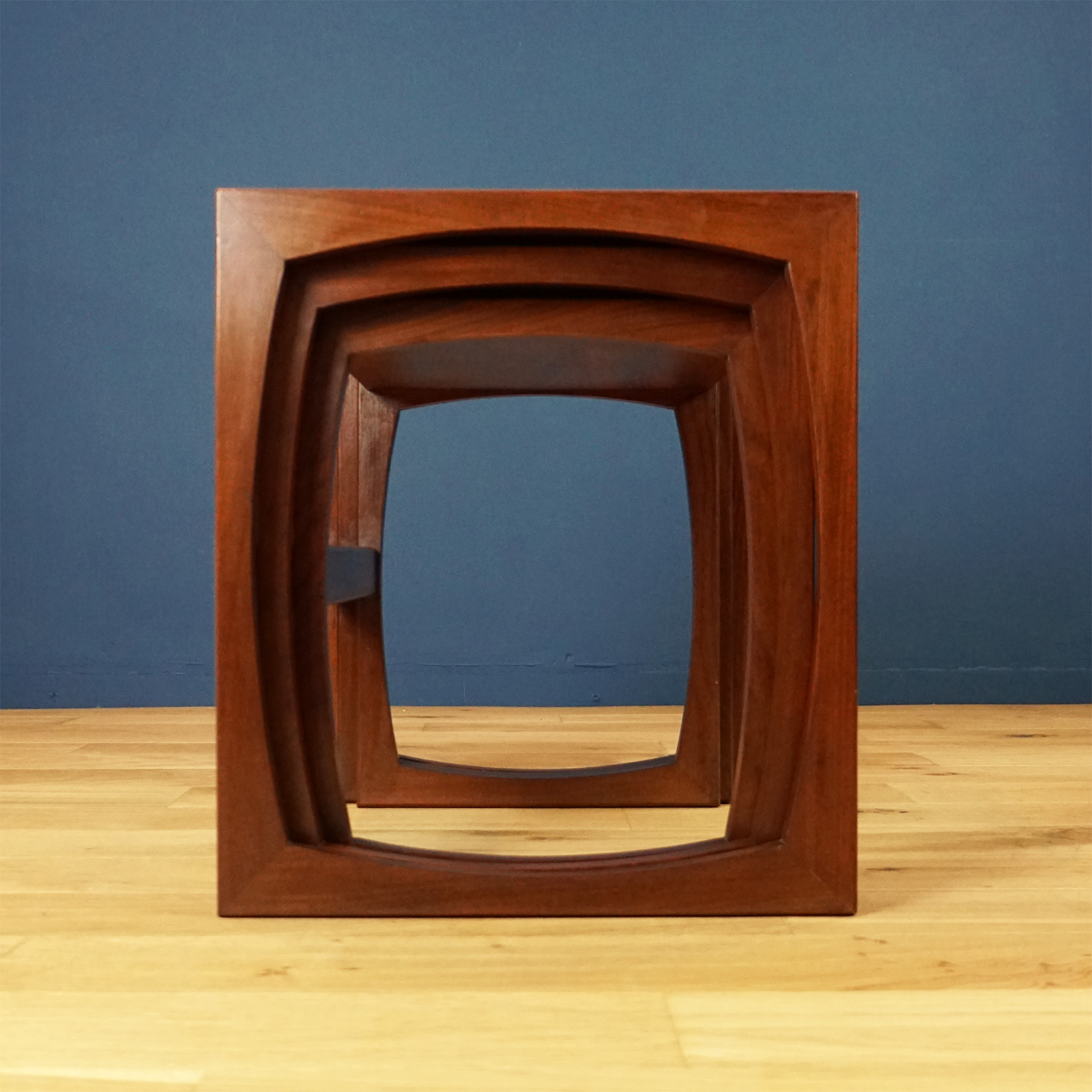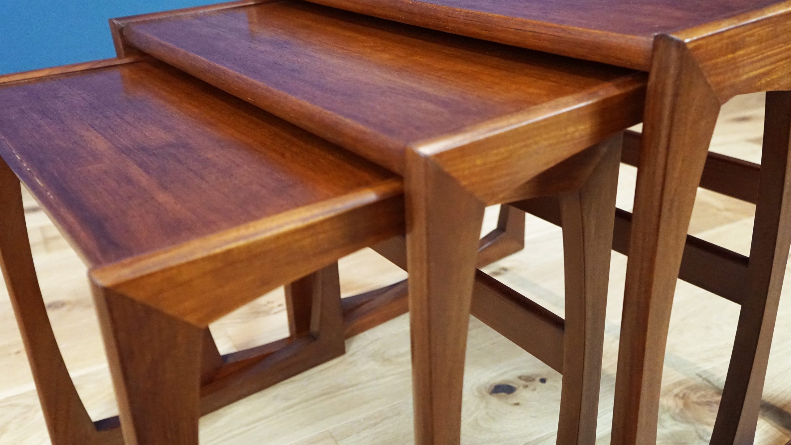 This iconic mid-century trio features the distinctive curved frame and rich teak finish that define the Quadrille range, one of G Plan’s most beloved collections. With their sculptural legs and seamless nesting design, these tables bring both elegance and practicality to any interior.