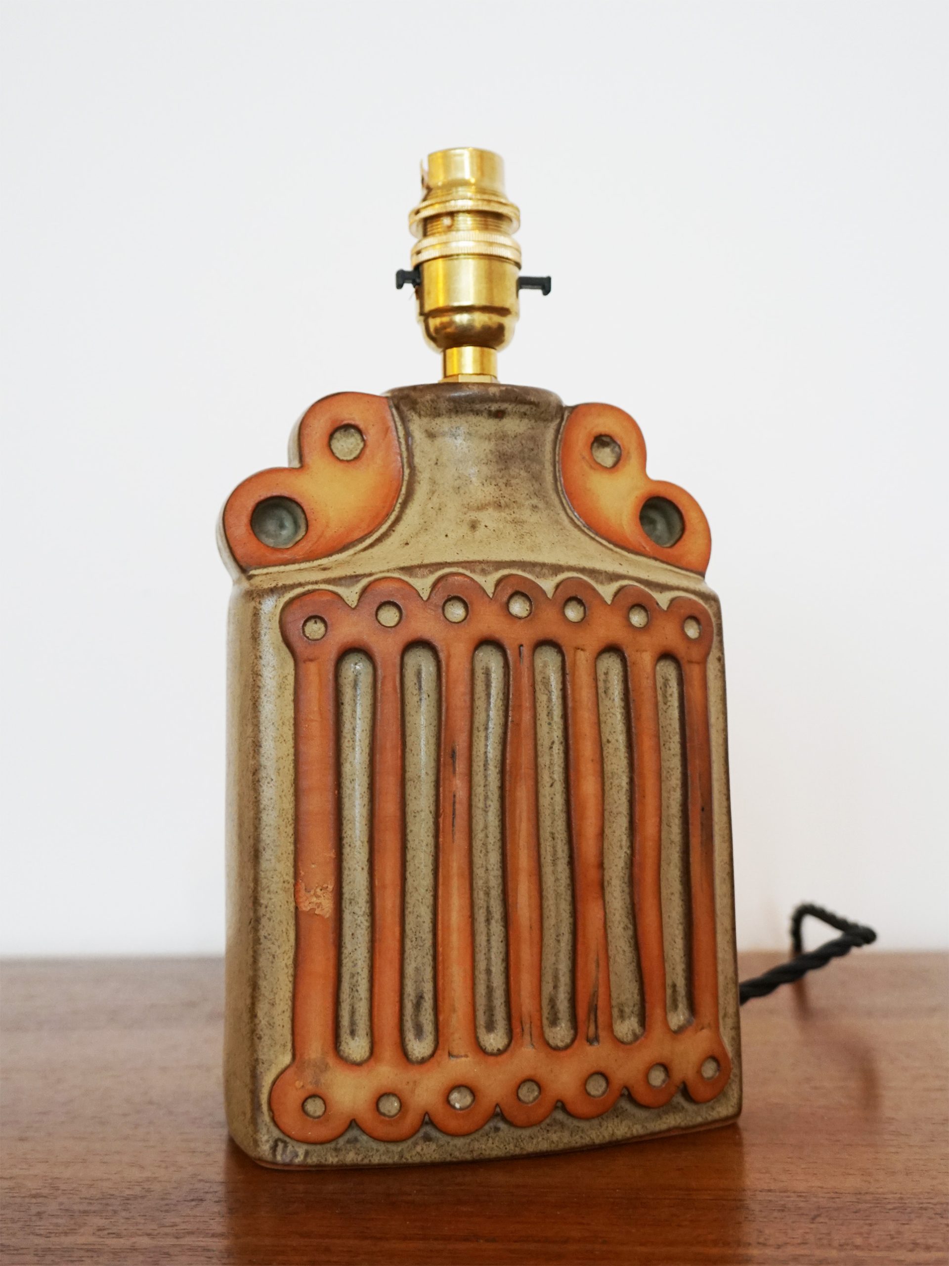 A rare ceramic lamp by Cornish maker Louis Hudson, stamped with his LH mark. Produced in short runs during the 1960s–70s, Hudson’s work is increasingly scarce and highly regarded among collectors. This example showcases his distinctive geometric motifs and earthy mid-century palette, blending Cornish studio pottery heritage with modernist design. A striking statement piece and a sound investment for the collector of mid-century lighting and ceramics.