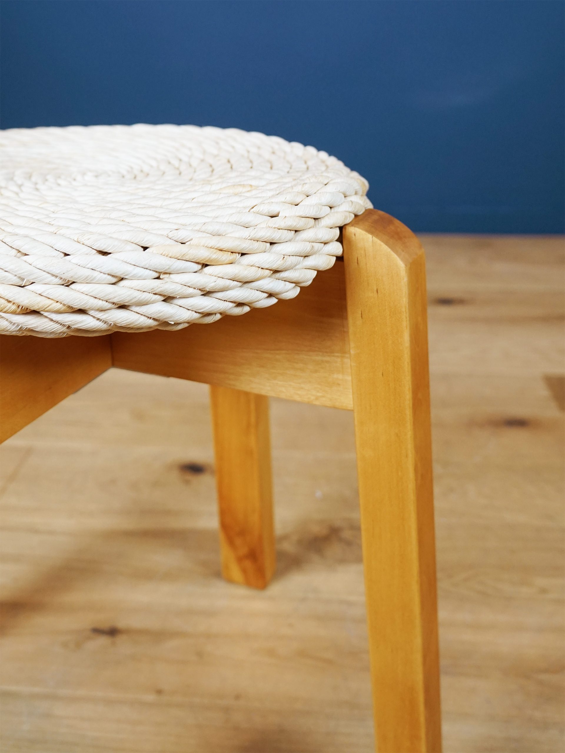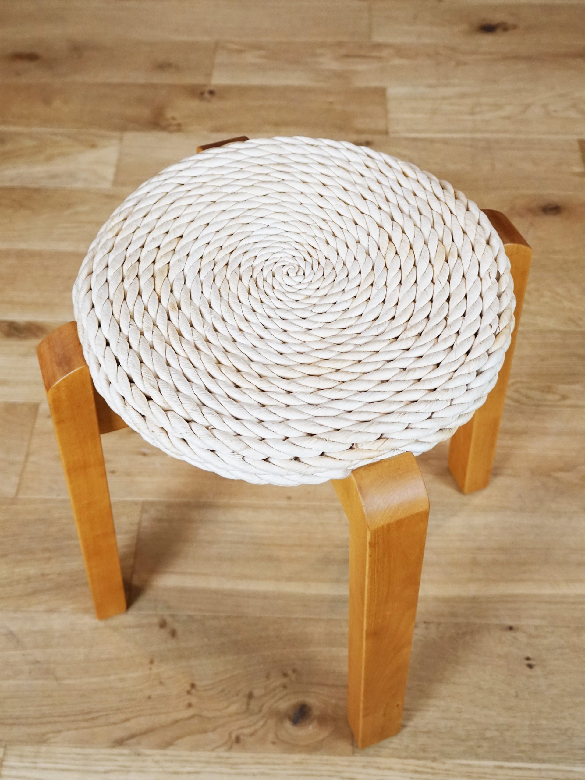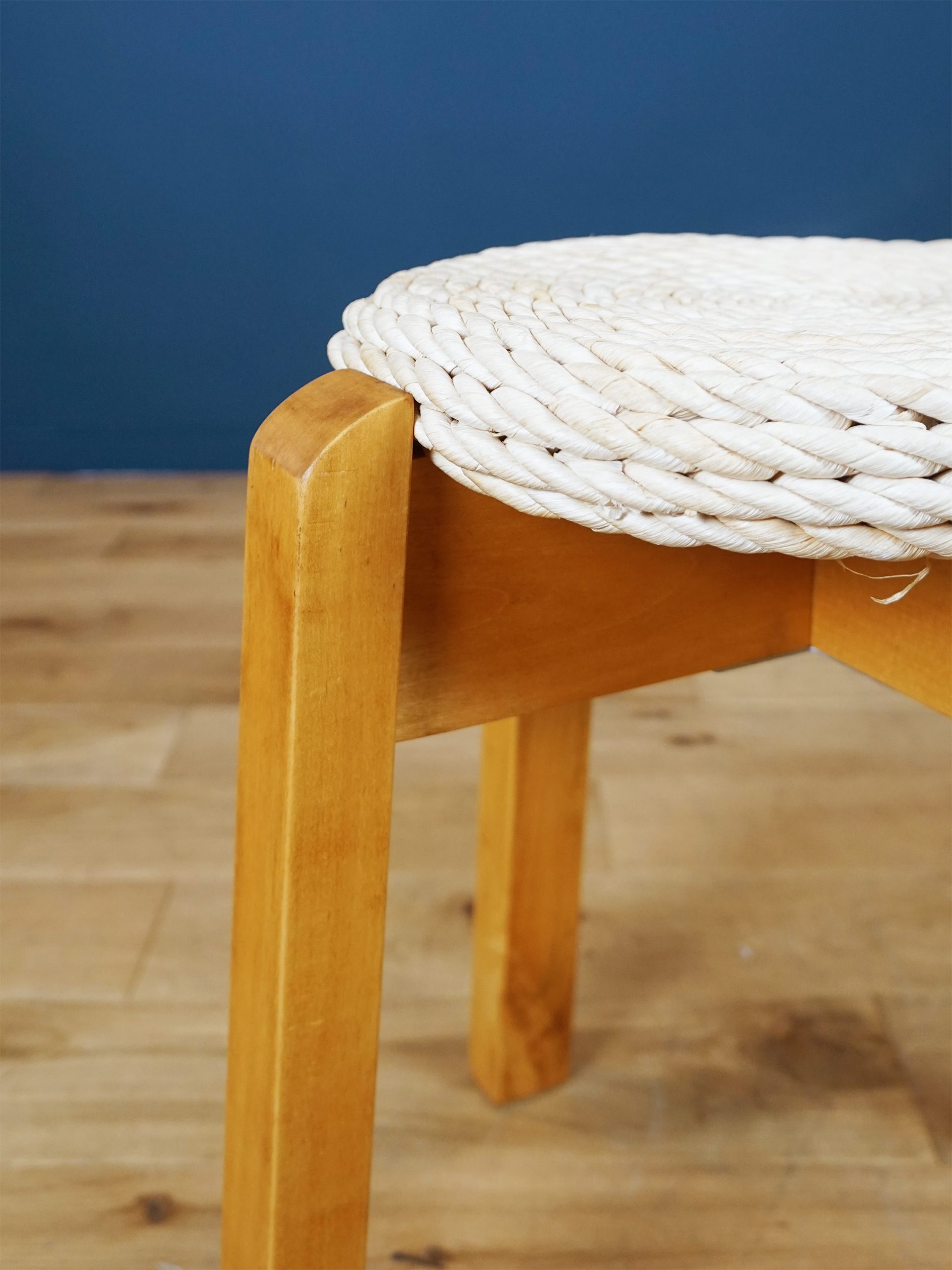 A wonderful mid-century Scandinavian solid birch stool with a coiled paper cord rope seat.