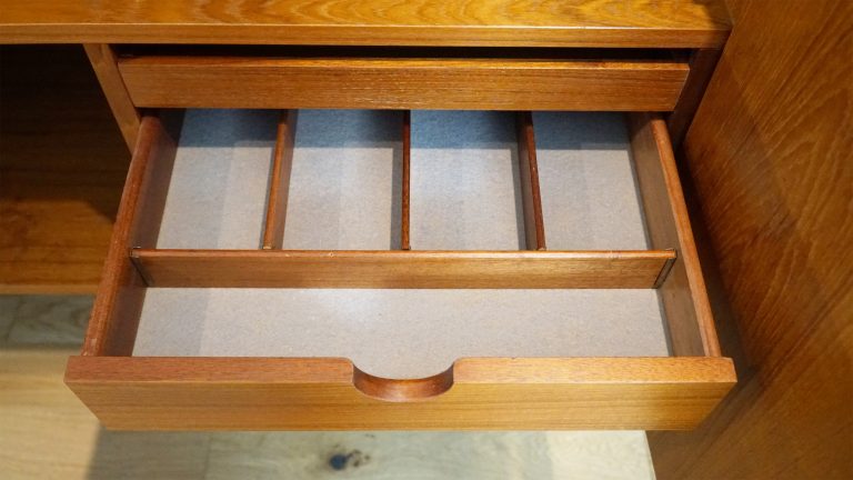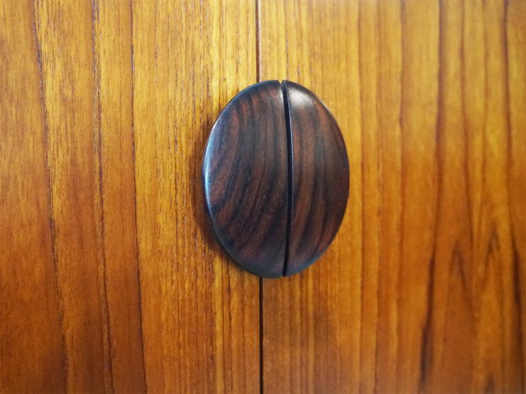 Part of what makes this example so compelling is its rarity, particularly in Cornwall, where pieces from the Danish range surface far less frequently than in major urban centres. The design itself is instantly recognisable: four large doors with bold round rosewood handles, elevated on elegantly shaped legs and distinctive curved stretchers. Behind one of the doors sits a set of beautifully proportioned internal drawers, a quiet but telling detail that speaks to the intelligence of Kofod-Larsen’s design. The proportions are balanced and architectural, allowing the rich teak veneers to read as the true focus of the piece. In many ways, the 4060 embodies his design philosophy — functional, graceful, and timeless.