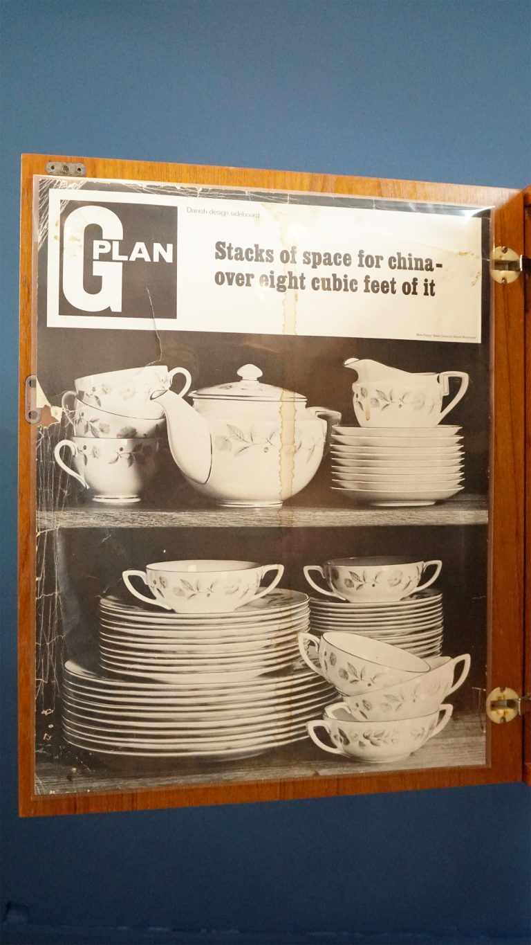 What elevates this particular sideboard beyond a desirable example to an exceptional one is the survival of its original G Plan promotional poster. This was carefully removed, preserved, and later reattached in its original position inside the door. Such ephemera is rarely preserved at all, as most were removed, lost, or damaged over decades of use. Its presence provides a direct link back to the piece’s original context as a new, aspirational product in the early 1960s British home. It adds cultural and historical value far beyond the sideboard’s visual appeal alone.